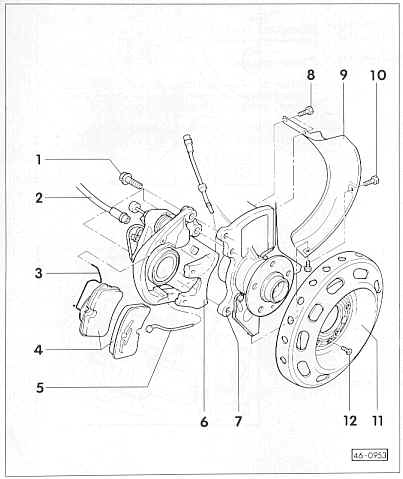 ACHTUNG! Kompletten Reparatursatz einbauen. Das Prüfen der Bremsen kann auf allen handelsüblichen Bremsprüfstanden und ohne zusätzliche Bedienungshinweise durchgeführt werden 1 Rippschraube 125NM, bei Wiederverwendung Verrippung reinigen 2 Bremsschlauch, bei Ersetzen der Bremsbeläge nicht abschrauben. 3 Belaghaltefeder, immer ersetzten 4 Bremsbeläge, mit Bremsbelagverschleißanzeige bei entsprechendem Belagverschleiß leuchtet im Kombiinstrument eine Kontrolllampe auf 5 Leitung für Bremsbelagverschleißanzeige, im Bedarfsfall ersetzen. 6 Bremssattel, Instandsetzung nicht vorgesehen, im Bedarfsfall komplett ersetzen. 7 Radlagergehäuse 8 Sechskantschraube 5 NM 9 Abdeckblech 10 Sechskantschraube 10NM 11 Bremsscheibe, Achsweise ersetzen, Bremsscheibendurchmesser 310/312mm, Bremsscheibendicke: 25mm 12 Fixierschraube |